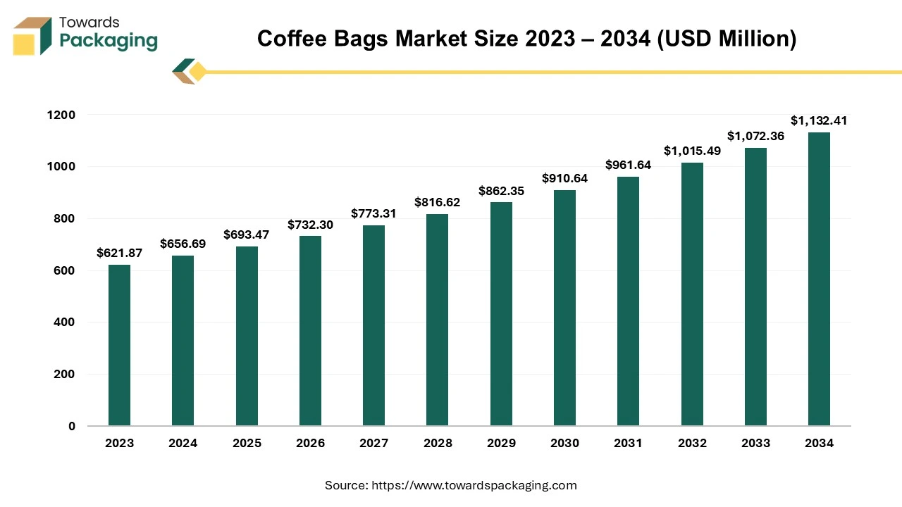The global coffee bags market is projected to grow from USD 693.47 million in 2025 to USD 1132.41 million by 2034, driven by the increasing demand for convenient, eco-friendly packaging and specialty coffee consumption. This report highlights trends in stand-up pouches, sustainability, and retail expansion, with a focus on North America and Europe.