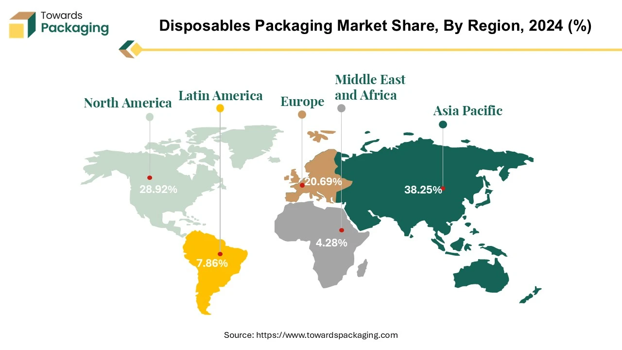 As urban populations rise, there is a higher demand for easy, ready-to-use packaging options in a variety of industries such as food, hygiene products, and healthcare. In these regions, disposable packaging is becoming important for modern lifestyles, as busy consumers seek quick and easy alternatives for daily demands. Additionally, the rise of the e-commerce sector in emerging nations is further likely to create opportunities for the market growth. For instance, as per the data by the Mexican Online Sales Association, the value of the domestic e-commerce market in 2022 was projected to be USD 26.2 billion, up by 23% compared to 2021. In 2022, there were approximately 63 millions of Mexicans using e-commerce, a 5.5 million rise since 2021. This rapid expansion of the food delivery and retail sectors in cities throughout China, India and Mexico has created substantial demand for the disposable packaging that guarantees hygiene and product safety.