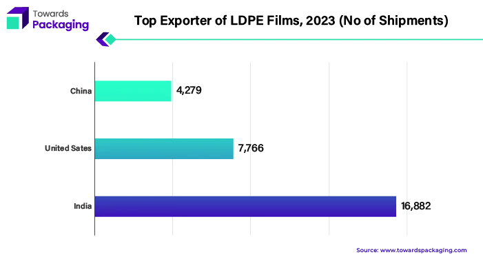 LDPE films are major exporters of China, United States, and India. These countries have on their side expertise in manufacturing as well as well-established export infrastructure channels which enable them to sell LDPE films in the global market at a relatively low cost. Modifications of LDPE can be developed for different uses and specific end products by adjusting its properties. To explain, the low-slip properties are ideal for the safe stacking, at the same time the high- slip properties are suitable for the easy packing into the outer containers. LDPE's cost-effectiveness is the reason for its wide use in production of various products like transparent pouches, bags, papers and boards coatings, laminates as well it is often applied as copolymer component of tubs and trays. LDPE resins that have been developed to be used for specific applications such as dry cleaner bags, bread bags, paper towel overwrap and shipping sacks.